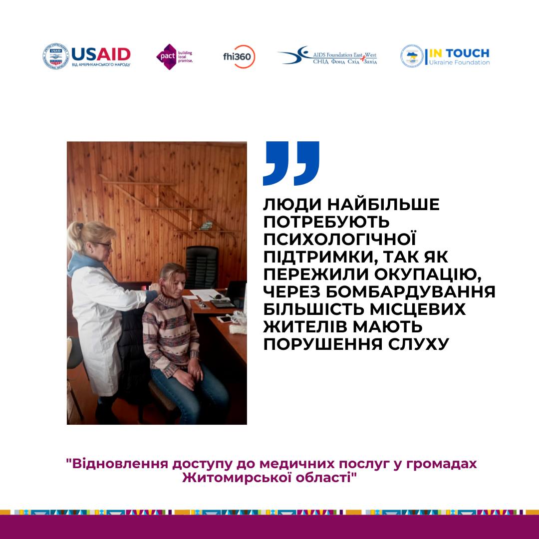 Такі активності здійснюються на Житомирщині In Touch Ukraine Foundation у межах проєкту “Відновлення доступу до медичних послуг у громадах Житомирської області”, що реалізується в рамках підтримки проєкту USAID – US Agency for International Development