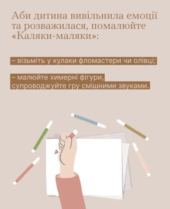 Навіть у складні часи пам’ятайте про прості та веселі ігри — вони відволікають, допомагають виплеснути емоції та якийсь час безтурботно порадіти. Вимкніть серйозність та запропонуйте дитині помалювати «Каляки-маляки».