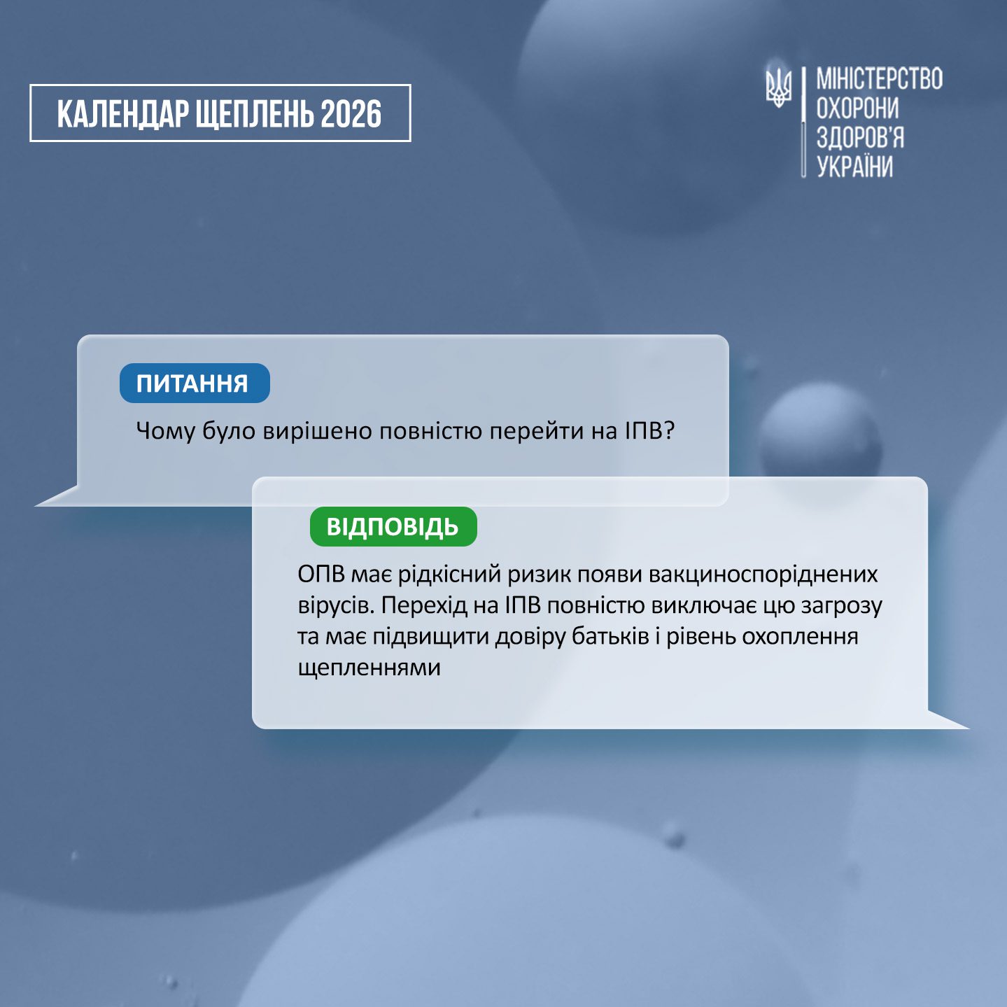 💬 Відбувся перехід на використання інактивованої («неживої») поліомієлітної вакцини, оральна поліомієлітна вакцина (ОПВ) більше не застосовуватиметься.