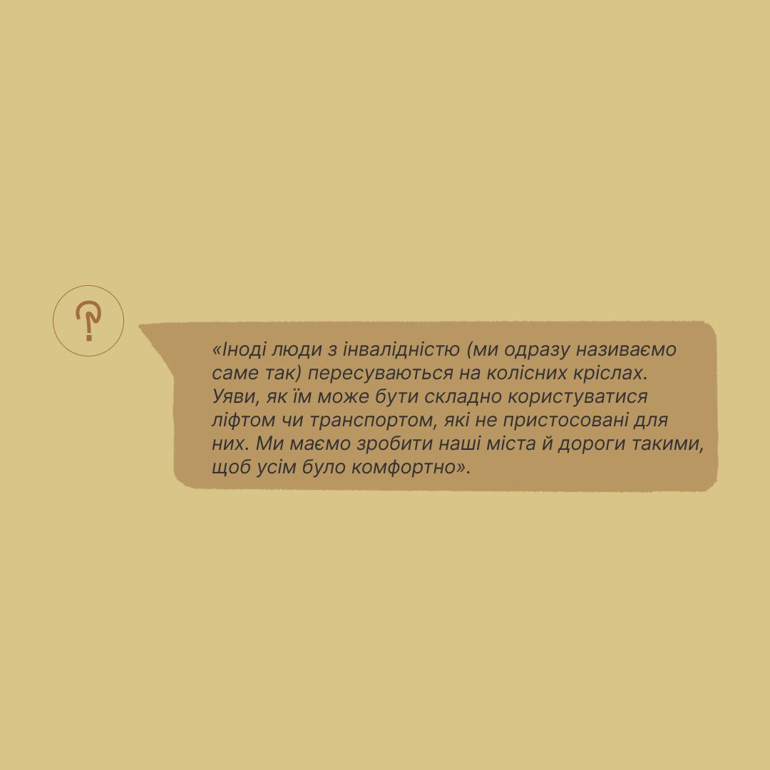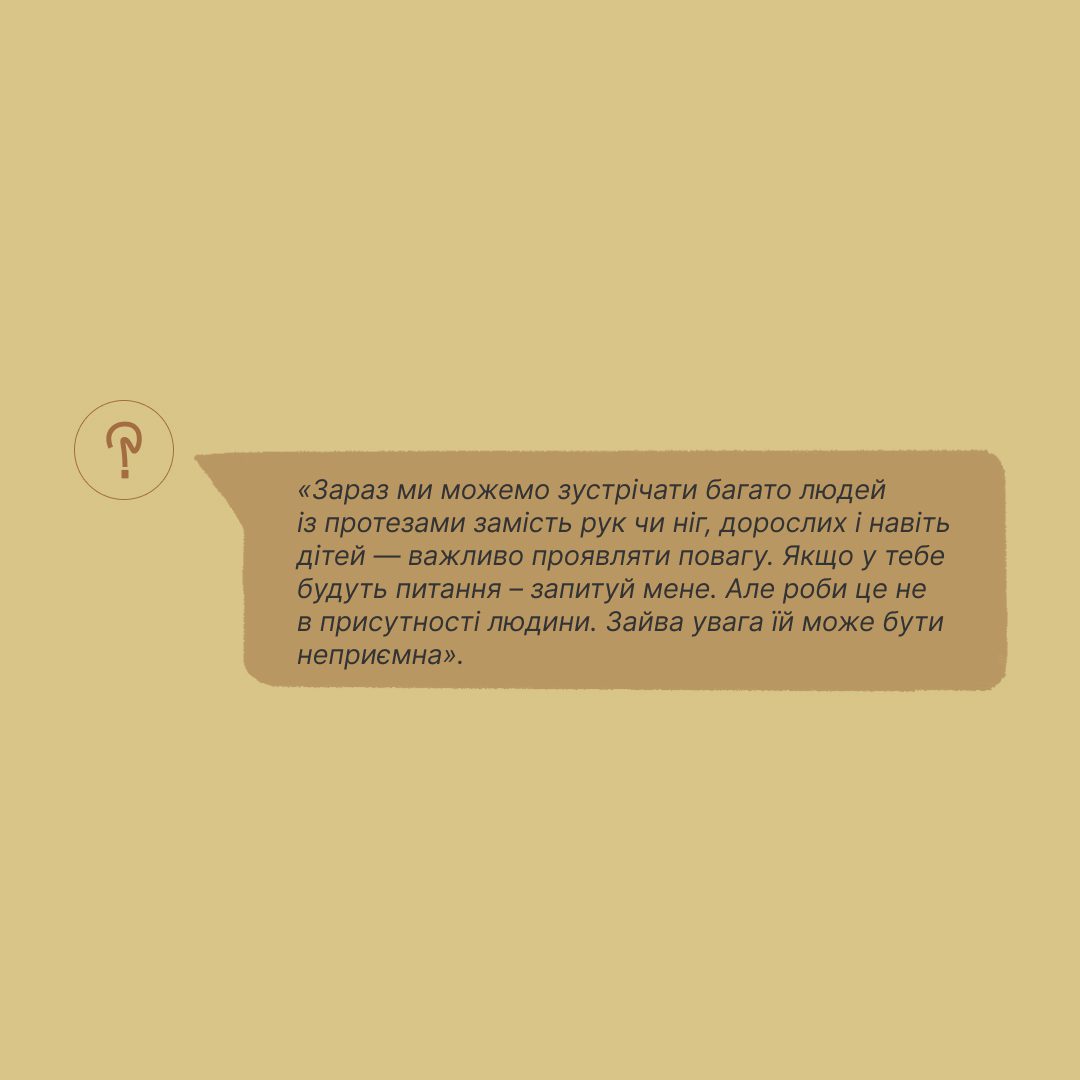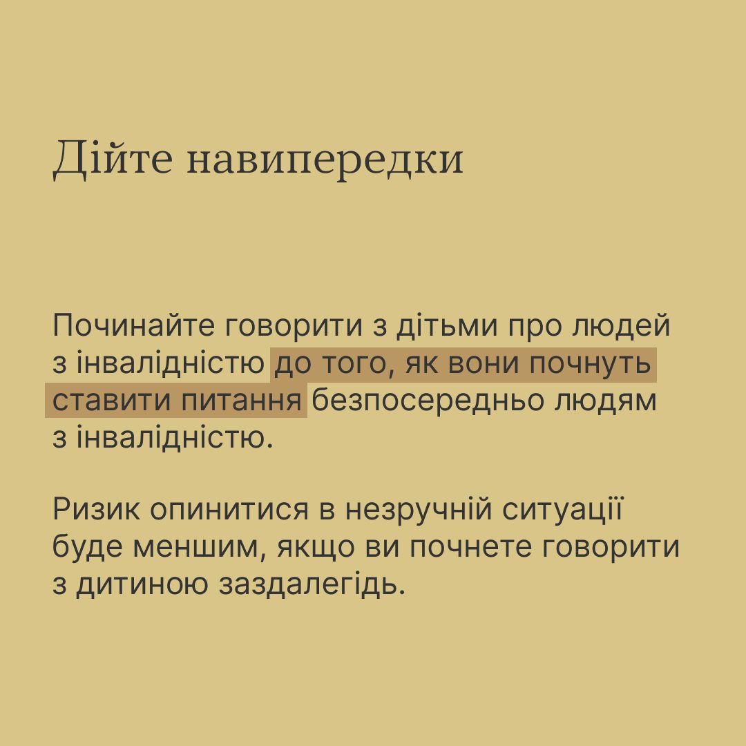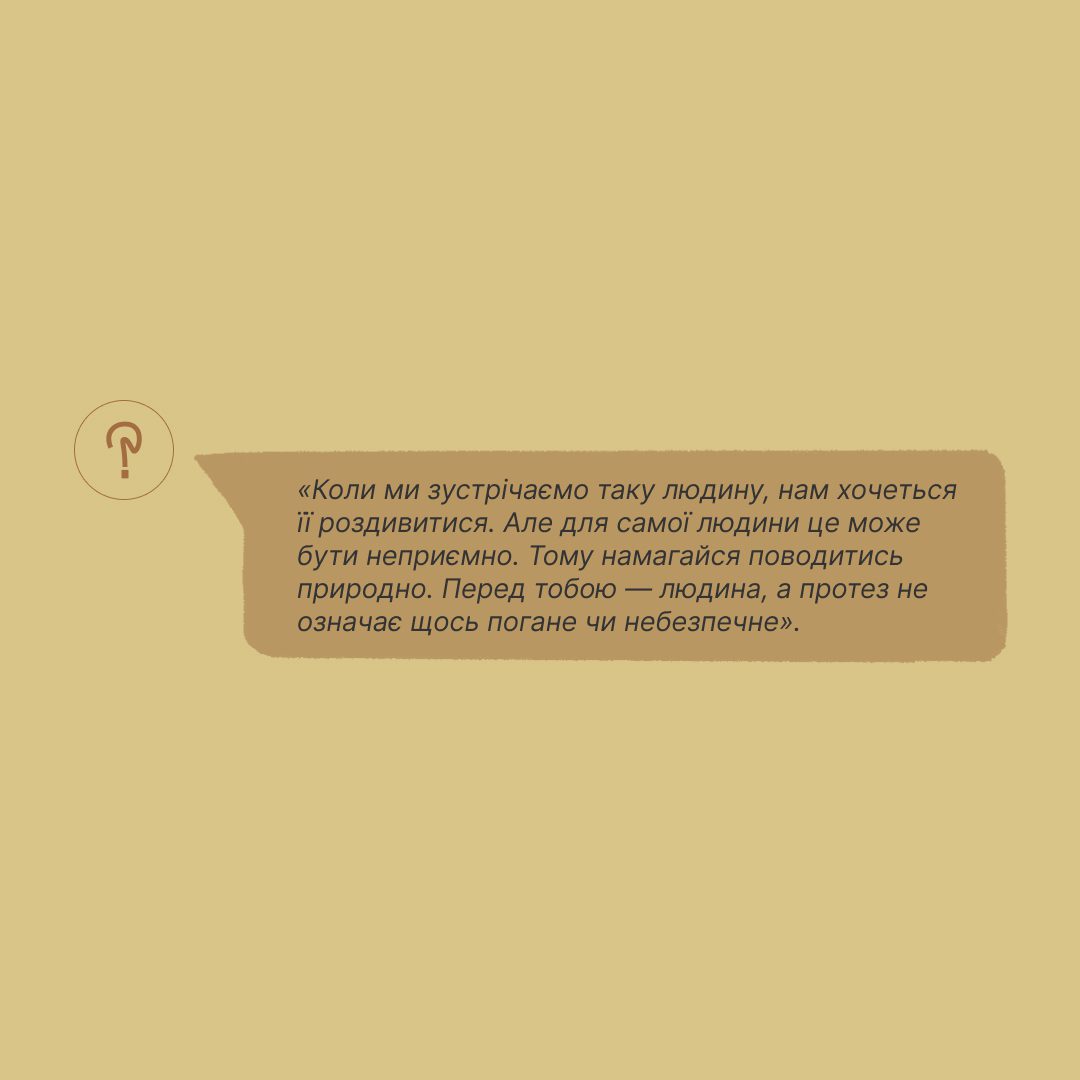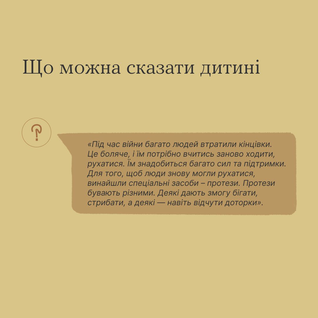 Людей із наслідками важких травм та інвалідністю ми зустрічаємо ледь не щодня. Це складна тема для розмови з дитиною, і нам, можливо, хотілося б її уникнути, але говорити про це важливо. По-перше, щоби підготувати дитину до такої зустрічі (її може налякати те, чого вона не розуміє); по-друге, аби проявити повагу.